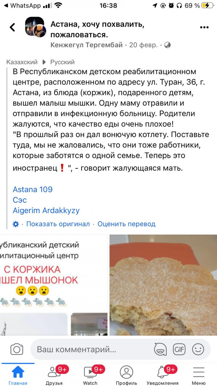 "Мышь в коржике": названы результаты проверки в детском реабилитационном центре Фото:Кенжегүл Тергембай/facebook.com