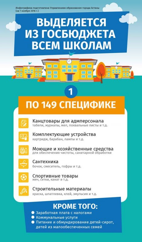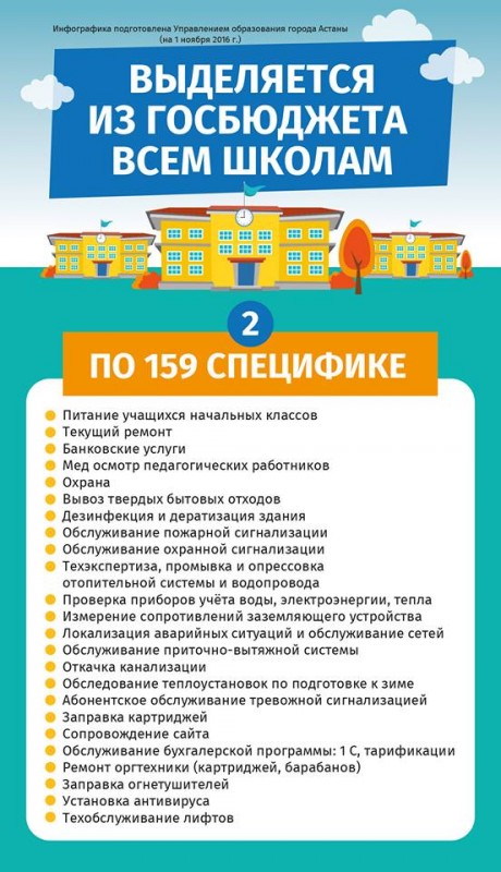 "Уважаемые родители! Ниже представлен список вещей и перечень услуг в школах, на которые выделяются денежные средства из государственного бюджета. Также прикрепляю копию приказа о запрете незаконного сбора денежных средств с родителей", - написала в Facebook пресс-секретарь Управления образования Астаны Жазира Асанова.