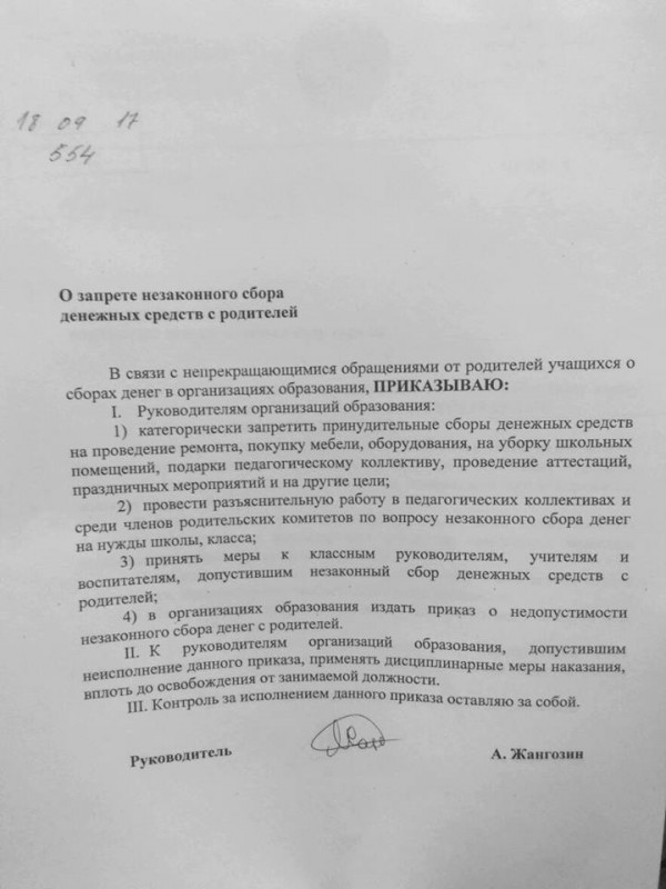 В приказе отмечено, что за сбор денег учителей могут уволить. Подобные меры вызваны "непрекращающимися обращениями от родителей учащихся о сборе денег в организациях образования".