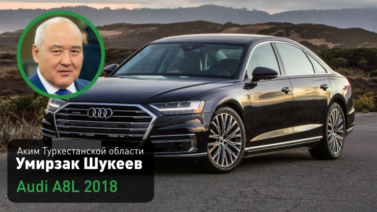 Аким Туркестанской области Умирзак Шукеев (на этой должности с 26 февраля 2019 года) ездит на служебном автомобиле Audi А8 L 2018 года. Цвет - черный металлик.