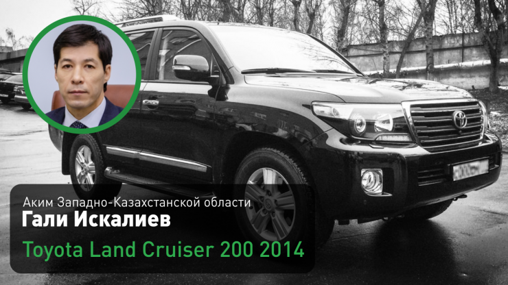 Аким Западно-Казахстанской области Гали Искалиев (на этой должности с июня 2019 года) передвигается на служебном автомобиле Toyota Land Cruiser 200 2014 года выпуска черного цвета.