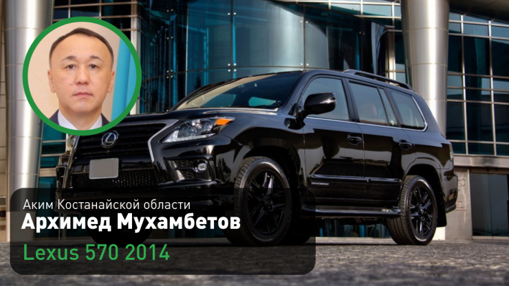 За акимом Костанайской области Архимедом Мухамбетовым (на этой должности с 11 сентября 2015 года) закреплена автомашина марки Lexus 570 черного цвета 2014 года выпуска.