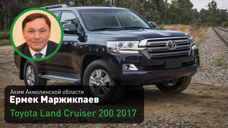 Аким Акмолинской области Ермек Маржикпаев (на этой должности с марта 2019 года) ездит на Toyota Land Cruiser 200 2017 года выпуска черного цвета.