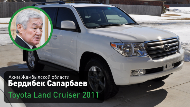 Аким Жамбылской области Бердибек Сапарбаев (на этой должности с 10 февраля 2020 года) ездит на белом Toyota Land Cruiser 2011 года выпуска.
