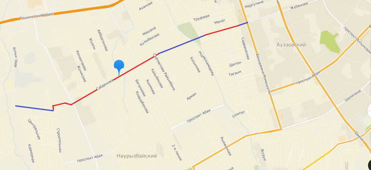 Пробивка Жубанова в сторону Карьерной (выделено синим). Улицы Сабденова и Карахана выделены красным. Коллаж ©Tengrinews.kz/Шокан Алхабаев