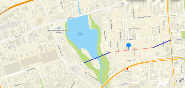 Отметим, что улицу Жубанова предлагали удлинить и в восточную сторону. Здесь ее хотят соединить с улицей Шевченко. Между ними расположена улица Есенжанова, которую могут расширить и присоединить к проекту. Также на пути новой дороги находится озеро Сайран. При укладке улицы здесь могут возвести мост, эстакаду либо другое подвесное сооружение. Общая протяженность предлагаемых работ составляет 2,4 километра. Построить дорогу также рекомендовали до 2030 года.