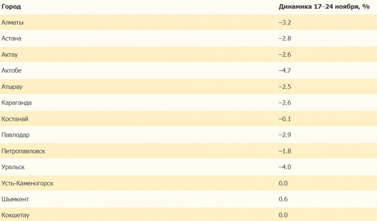 По данным аналитиков, за период 17-24 ноября ставки упали почти во всех городах, где проводится мониторинг, кроме Шымкента, в котором наблюдается незначительный рост.