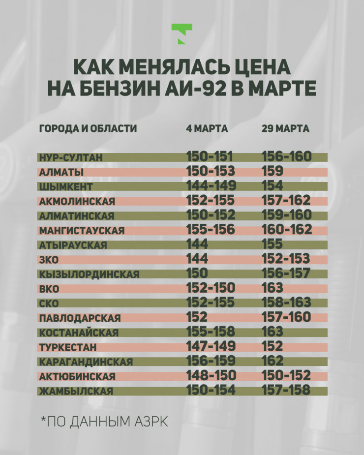 Подорожание бензина АИ-92 наблюдается во всех регионах страны. В Нур-Султане стоимость возросла на 5-9 тенге, в Шымкенте бензин подорожал на 5-10 тенге. В Алматы средняя цена поднялась со 150-153 до 159 тенге за литр.