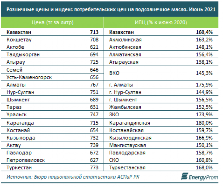 В июне 2021 года в магазинах и на рынках Казахстана подсолнечное масло продавалось по 713 тенге за литр. За год цены на подсолнечное масло выросли сразу на 60,4 процента, передает Tengrinews.kz со ссылкой на Energyprom.kz.