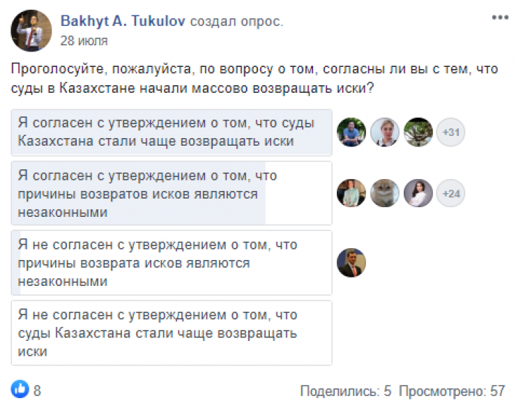 Также в соцсети появилась общественная группа "Массовый возврат исков судами Казахстана", куда вступили пока 80 человек.