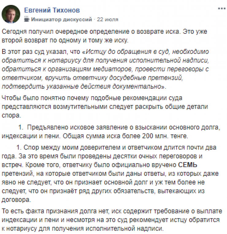 Юрист Евгений Тихонов 22 июля в Facebook рассказал, что получил очередное определение о возврате иска.
