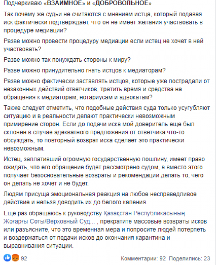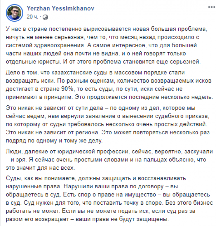 "По разным оценкам, количество возвращаемых исков достигает в стране 90 процентов. То есть суды иски сейчас не принимают в принципе. Это никак не зависит от сути дела: по одному из дел, которое мы сейчас ведем, нам вернули заявление о вынесении судебного приказа, по которому от судьи требовалось несколько очень простых действий. Это никак не зависит от региона. Это может повторяться несколько раз подряд по одному и тому же делу", - написал Ержан Есимханов в Facebook.