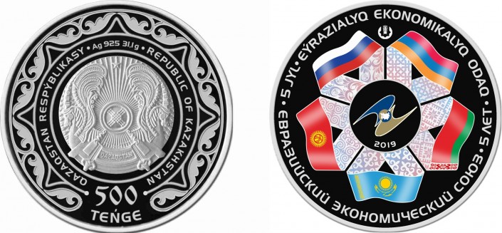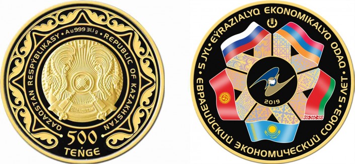 Национальный банк Республики Казахстан 21 мая 2019 года выпускает в обращение коллекционные монеты "Евразийский экономический союз. 5 лет" из золота номиналом 50 000 и 500 тенге и из серебра номиналом 500 тенге, передает Tengrinews.kz.