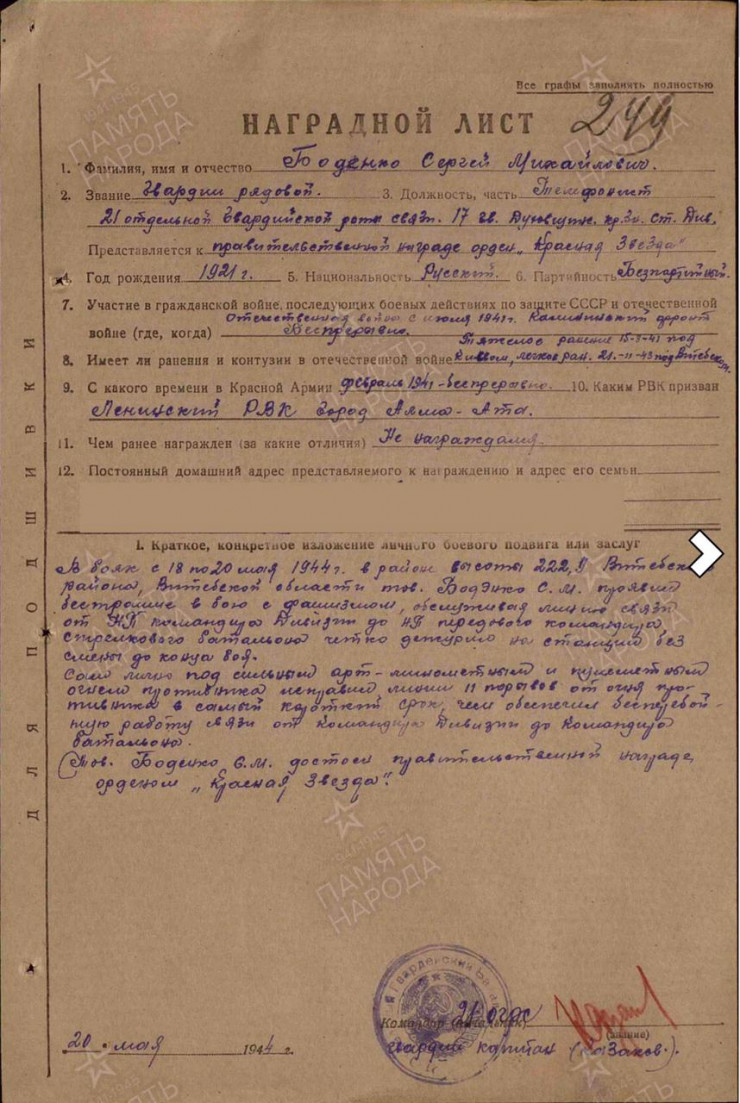 "В боях с 18 по 20 мая 1944 года в районе высоты 222,9 Витебского района Витебской области товарищ Боденко С.М. проявил бесстрашие в бою с фашизмом, обслуживая линию связи от НП командира дивизии до НП передового командира стрелкового батальона, четко дежурил на станции без смены до конца боя. Сам лично под сильным артминометным и пулеметным огнем исправил на линии 11 порывов от огня противника в самый короткий срок, чем обеспечил бесперебойную работу связи от командира дивизии до командира батальона", - говорится в наградном листе, датированном 22 мая 1944.