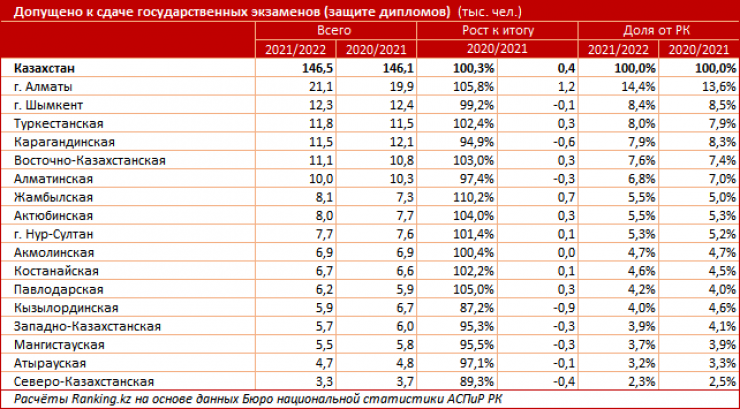 Среди допущенных к экзаменам лидирует Алматы: 21,1 тысячи студентов. Далее идут Шымкент (12,3 тысячи студентов) и Туркестанская область (11,8 тысячи студентов).