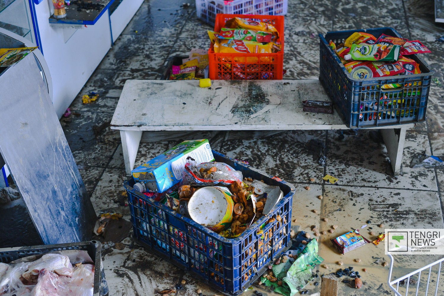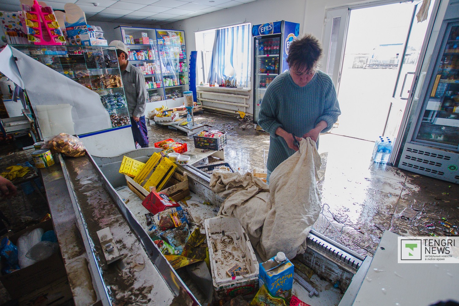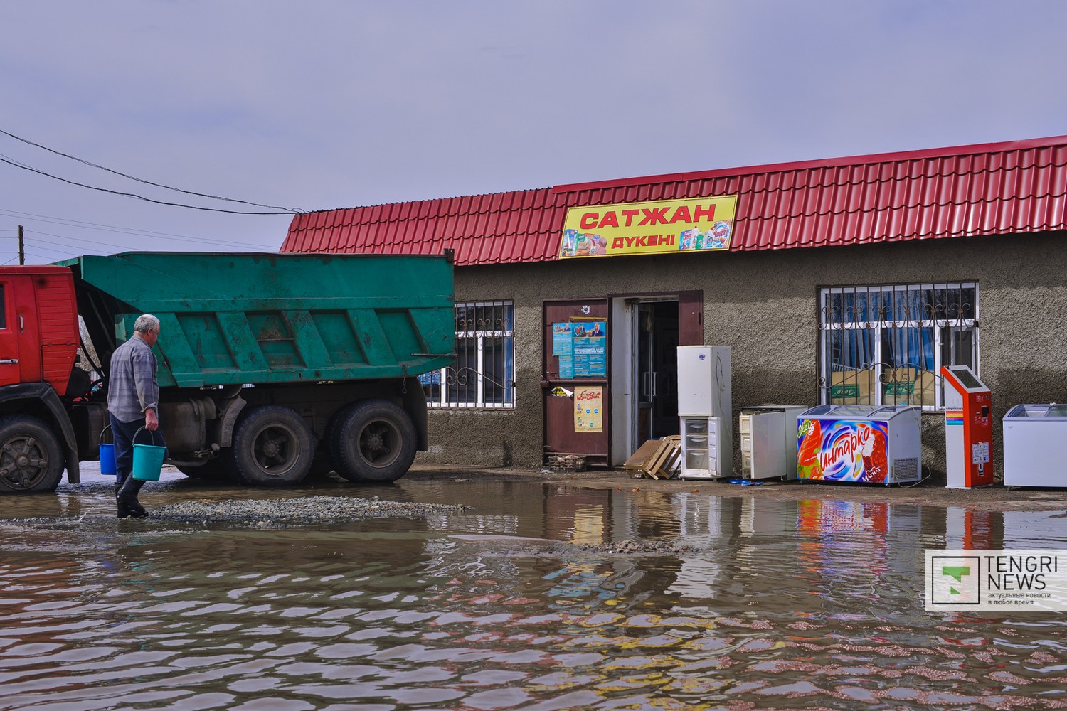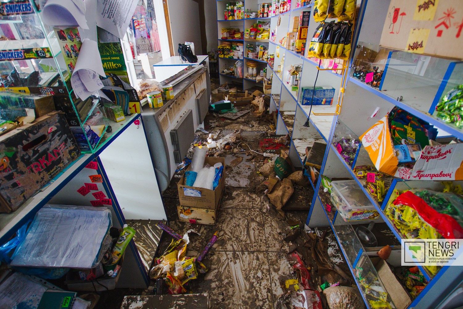 Это один из крупных магазинов в поселке. Здесь продают игрушки, бытовую химию и продукты питания. Хозяева мини-маркета накануне празднования Пасхи заполнили все прилавки. На следующий день в поселок пришла большая вода. В здании магазина она была по пояс. Несколько дней в воде плавало все холодильное оборудование, забитое мясом и молочной продукцией. По подсчетам владельцев торговой точки, с водой утекли сотни тысяч тенге.