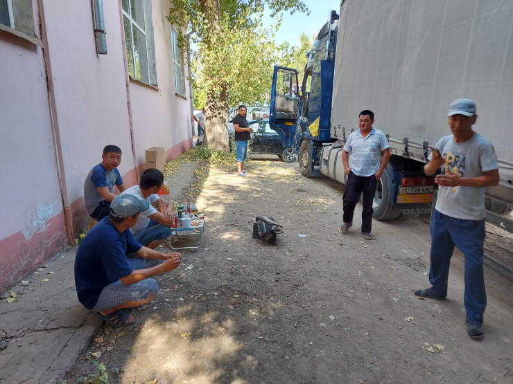 Возле оптовой базы продуктов питания сейчас находится несколько десятков большегрузов с кыргызстанскими госномерами. При этом водители живут на прилегающей к улице территории, готовя еду под открытым небом.