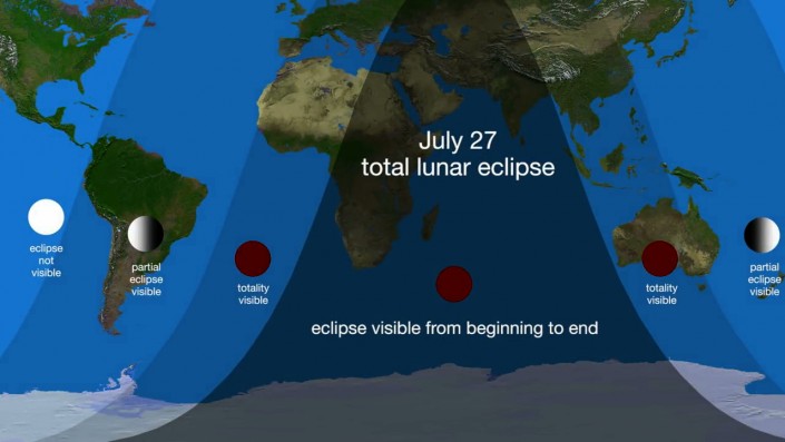 Судя по карте, жители Казахстана смогут увидеть редкое небесное явление от начала до конца. Лунное затмение будет видно на большей части земли 27 июля 2018 года. По крайней мере, часть затмения будет видна на всех основных территориях земли, кроме Северной и Центральной Америки, с полной видимостью на ближнем Востоке, в Индии, в частях Центральной Азии, а также Восточной и Южной Африки. Затмение начнется в 00.24 (по времени Астаны), с полным лунным затмением с 01.30 до 03.13 и закончится в 04.20.