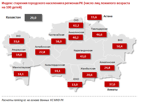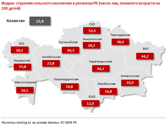 Самые старые села в Казахстане - в СКО, где индекс старения составляет 53,3, в Костанайской области (46,5) и в ВКО (44,2). Наиболее молодые села - в Мангистауской области (чуть больше 10 стариков на 100 детей), ЮКО (12) и Атырауской области (15,8).