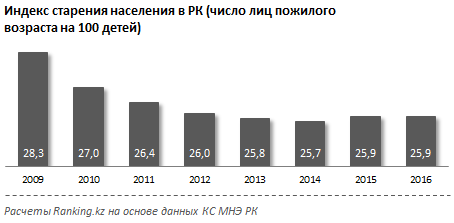 Аналитики считают, что Астана по сравнению с Алматы - город молодой. В столице индекс старения по итогам 2016 года составил 15,6 на 100 детей. В Алматы же уровень более чем в 2 раза выше, на 100 детей приходится по 37 стариков.