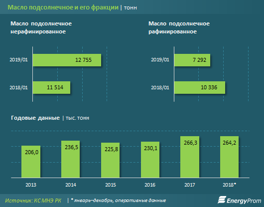 Что касается реализации масла на внутреннем рынке, по итогам 2018 года объемы сократились на 2 процента. К марту 2019 года цены на подсолнечное масло в магазинах и на базарах Казахстана выросли на 8,1 процента за год, до 432,8 тенге за литр.