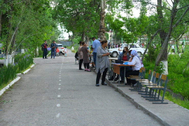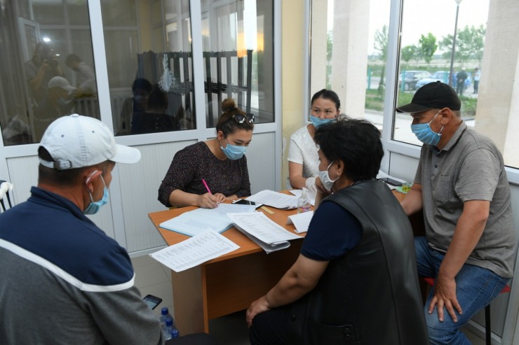 Сотрудники местного акимата записывают данные о прибывающих.