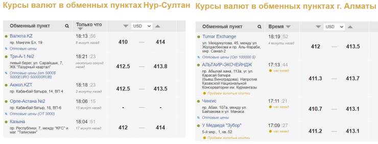 В настоящее время в обменных пунктах Нур-Султана американскую валюту продают за 413,5-414 тенге, покупают за 410-412,5 тенге. В обменниках Алматы продажа сложилась на уровне 413,1-413,7 тенге за доллар, покупка - на уровне 410,7-412 тенге за доллар.