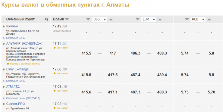 В обменниках Алматы продажа сложилась на уровне 417 - 417,5 тенге за доллар, покупка - на уровне 415,5 - 415,6 тенге за доллар.