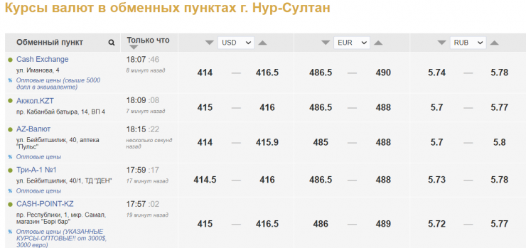 По данным Kurs.kz, в настоящее время в обменных пунктах Нур-Султана американскую валюту продают за 415,9 - 416,5 тенге, покупают за 414 - 415 тенге.