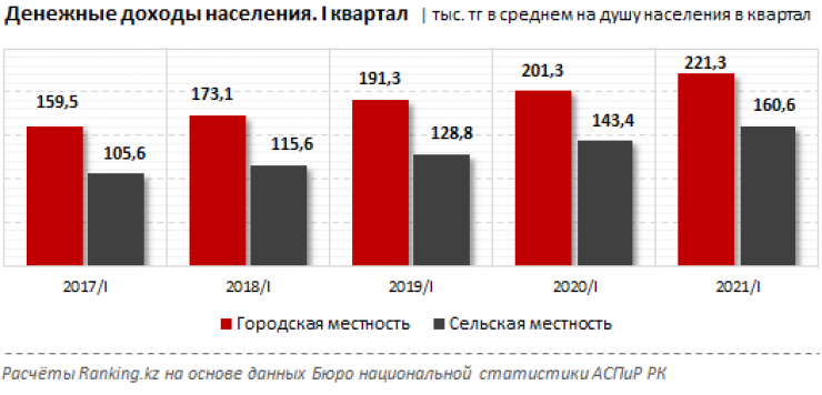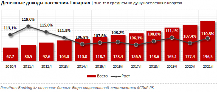 Денежные доходы населения за первый квартал текущего года составили 196,5 тысячи тенге в среднем на душу населения, передает Tengrinews.kz со ссылкой на Ranking.kz.
