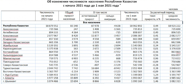 Общая численность населения страны достигла 18 миллионов 962 тысяч 892 человек. При этом на начало года в Казахстане насчитывалось 18 миллионов 879 тысяч 552 жителя. Прирост населения составил 83 тысячи 340 человек.