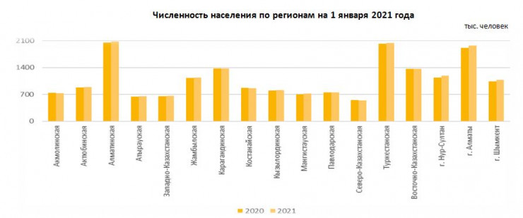 По официальным данным, за год численность населения увеличилась на 245 тысяч человек, или 1,3 процента. За 2020 год наибольший общий прирост наблюдался в трех регионах страны: в Алматы (60,2 тысячи человек), в Нур-Султане (48,5 тысячи человек) и Шымкенте (38 тысяч человек).