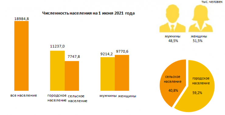 Численность населения страны на 1 июня 2021 года составила 18 миллионов 984 тысячи 800 человек, в том числе городского - 11 миллионов 237 тысяч (59,2 процента), сельского - 7 миллионов 747 тысяч 800 человек (40,8 процента).