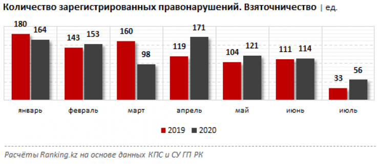 Только за июль на взяточничество пришлось 56 правонарушений - сразу на 69,7 процента больше, чем год назад, хотя при этом вдвое меньше, чем месяцем ранее.
