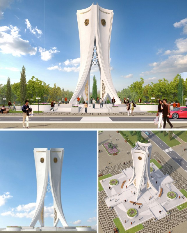 Монумент называется "Еркін Елдің Ертеңі" - "Будущее свободной страны". Проект выполнен в простой, лаконичной и динамичной форме. Высота монумента 25 метров - 25 лет Независимости Республики Казахстан. Расположен на стилобате квадратной формы по сторонам света. Имеет четыре равнозначных входа, четыре круглых цветника, четыре парные опоры - символы  слогана: "Төрт құбылаң түгел болсын". В верхней части плавно изгибающие формы, превращающиеся силуэтом в восьмигранник - символ слогана "Сегіз қырлы бір сырлы".