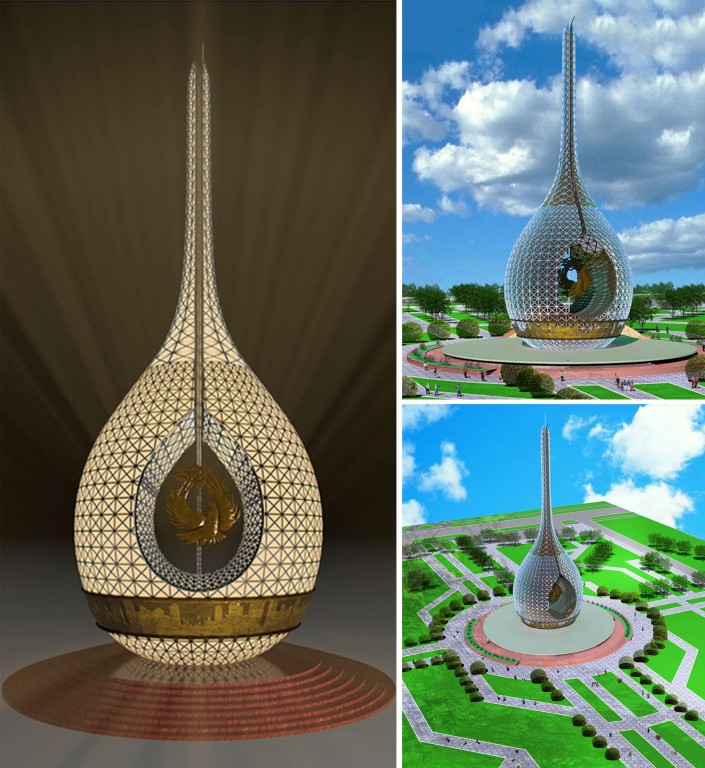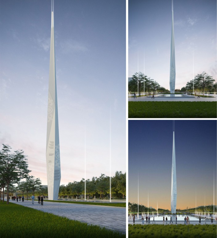 В выборе стилистического решения объекта использована универсальная и интернациональная форма строгой геометрической вертикали. А светло-серебристый цвет предлагаемого материала - титана - соответствует футуристическим горизонтам и трактуется как дальнейшее движение страны по пути созидания. Монумент, обращенный в небо, знаменует собой наши лучшие устремления и духовные порывы. Будущее всего мира - это вершины творческого духа.