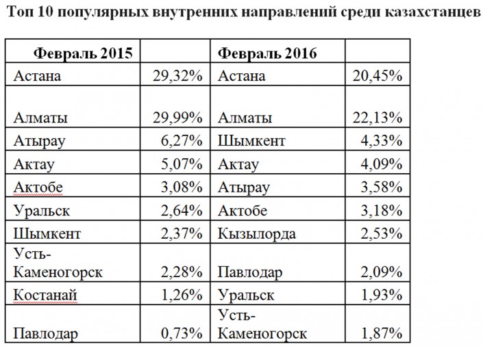 Также отмечается, что неизменно самыми популярными внутренними направлениями в феврале остались Астана (24 процента) и Алматы (26 процента).