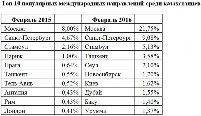 Так, отмечается уменьшение спроса на зарубежные направления по сравнению с прошлым годом. В феврале этого года казахстанцы отдали предпочтение более бюджетным странам для отдыха. На протяжении года самыми популярными международными направлениями остаются три города: Москва, Санкт-Петербург и Стамбул. По итогам февраля 2016 года, после этих трех лидирующих городов расположились Ташкент и Сеул. Также отмечается, что полеты в Москву в феврале участились в 1,5 раза по сравнению с февралем 2015 года.