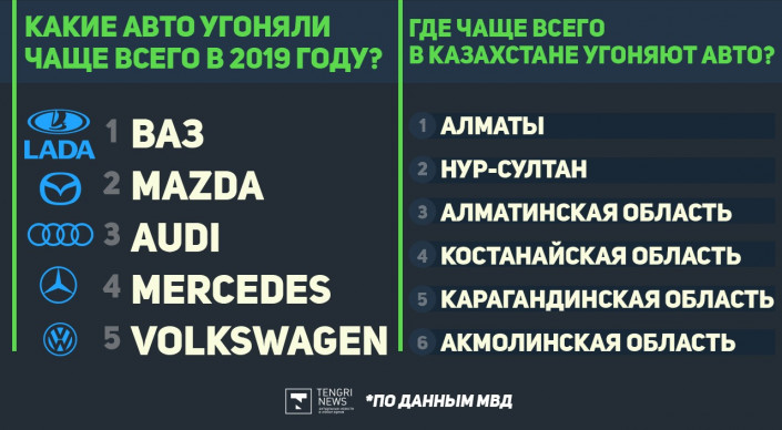 В 2019 году наиболее часто совершались угоны автомашин марок ВАЗ, Mazda, Audi, Mercedes и Volkswagen. Чаще всего названные машины воровали в Алматы, Нур-Султане, Алматинской, Костанайской, Карагандинской и Акмолинской областях.