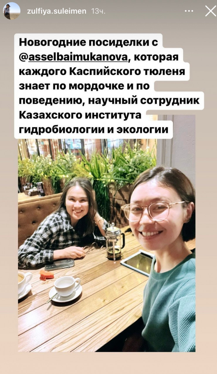 Судя по фото из Stories, за день до назначения Сулейменова пила чай со специалистом по каспийскому тюленю.