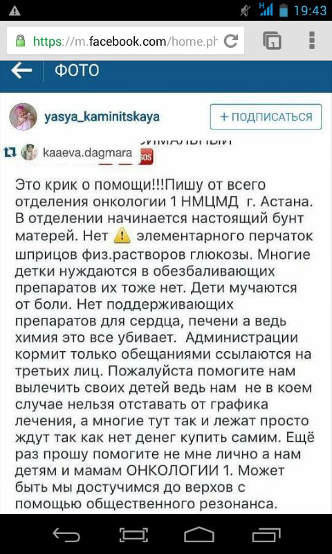 В социальных сетях распространялось сообщение матерей, дети которых находятся в отделении онкологии ННЦМД. "Это крик о помощи! Пишу от всего отделения онкологии ННЦМД Астаны. В отделении начинается самый настоящий бунт матерей. Нет элементарного: перчаток, шприцов, физрастворов, глюкозы. Многие детки нуждаются в обезболивающих препаратах, их тоже нет. Дети мучаются от боли. Нет поддерживающих препаратов для сердца, печени, а ведь химия все это убивает", - говорится в распространенном сообщении в Instagram.