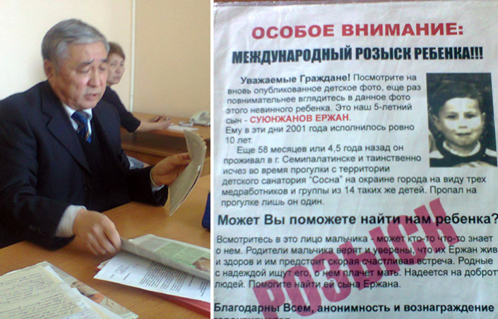 Летом 1996 года с территории детского санатория "Сосна" близ Семипалатинска исчез пятилетний Ержан Суюнжанов. К поискам ребенка были привлечены не только полиция, но и армия, а также сотни волонтеров. Сосновый бор вплоть до границ с соседней Павлодарской областью шаг за шагом прочесывали кинологи с собаками, обследовали с вертолета. Однако мальчик словно в воду канул.
