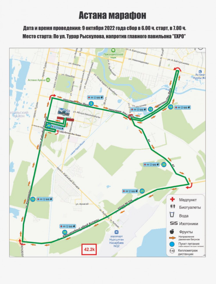 Дистанция 42,2 километра стартует с территории EXPO на улице Рыскулова. Далее по Кабанбай батыра – Улы Дала до Нажимеденова с разворотом в обратном направлении на Улы Дала, далее К1 – Южная и Юго-Западная объездная дорога – шоссе Каркаралы – Кабанбай батыра – Хусейн Бен Талал – Кабанбай батыра – Рыскулова – и финиш на территории EXPO.