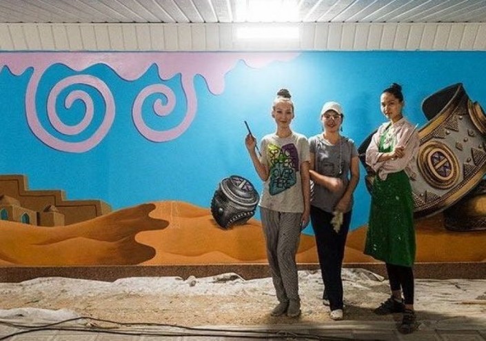 Девушки, как и другие художники, разрисовывают подземные переходы. Сейчас художницы украшают стены в "подземке" на Сатпаева - Манаса.