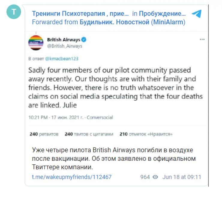 На самом деле этот твит являлся ответом на опубликованную одним из пользователей аудиозапись, в которой мужчина рассказывает, что его знакомый - пилот British Airways - якобы сообщил ему, что его привитые коллеги массово умирают в воздухе. И руководство компании ведет срочные кризисные переговоры о запрете на полеты для тех, кто вакцинирован против СOVID-19, пишет издание.