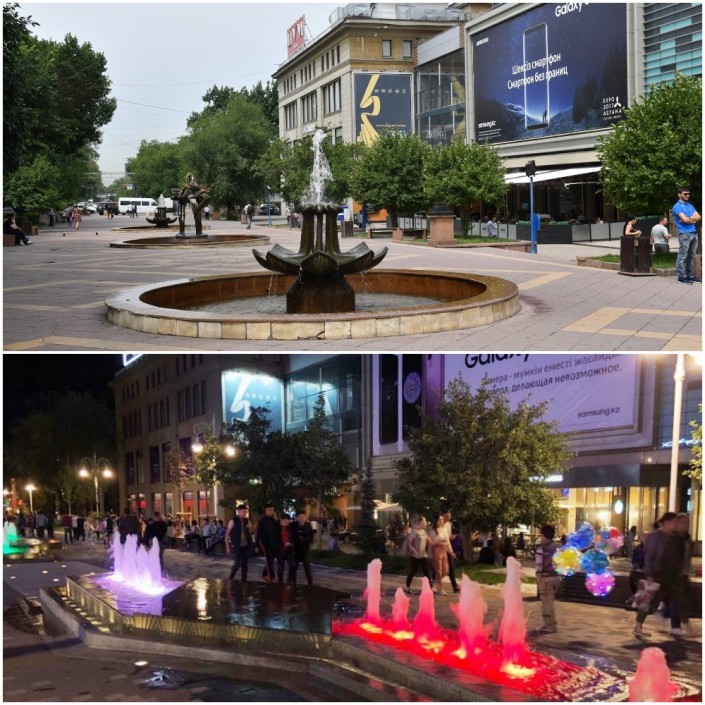 По проспекту Абылай хана реконструированы старые фонтаны на пересечениях с улицами Шевченко и Карасай батыра. Кроме того, сухой фонтан появился у привокзальной площади железнодорожного вокзала Алматы-2.