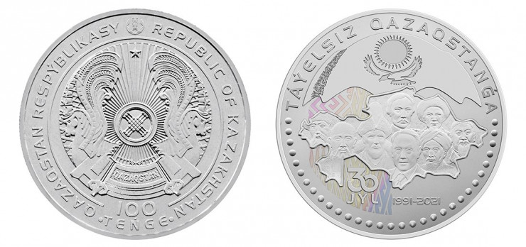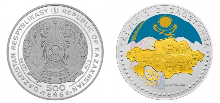 "Дизайн монет TÁÝELSIZ QAZAQSTANǴA 30 JYL отображает символическую связь с первой серией банкнот образца 1993 года независимого Казахстана, на которых размещены портретные изображения выдающихся исторических личностей. Композиция завершает визуальный портретный ряд и логически обозначает юбилейную веху в истории государства", - говорится в сообщении.
