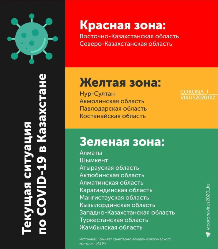 Тем временем в Telegram-канале Coronavirus2020.kz появилась таблица, в которой Акмолинская область отнесена к "желтой" зоне, а Алматы отнесен к "зеленой".
