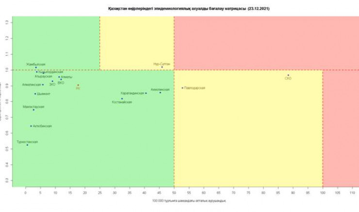 Согласно матрице оценки эпидемиологической ситуации в регионах Казахстана на 23 декабря, в "красной" зоне ни одного региона.