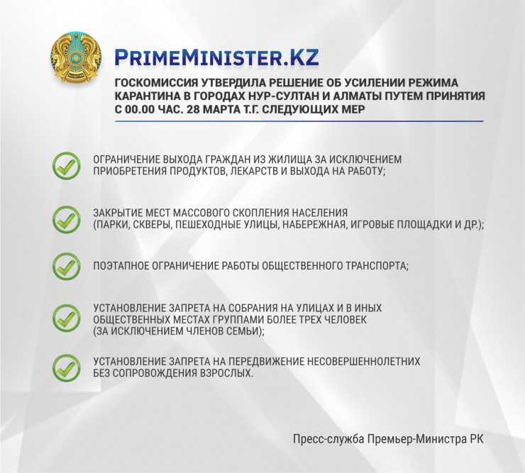Госкомиссия утвердила решение об усилении режима карантина в Нур-Султане и Алматы путем принятия с полуночи 28 марта следующих мер: